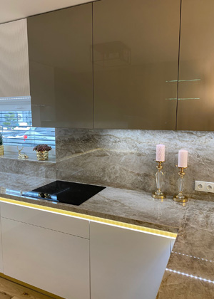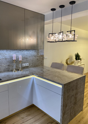 Zatímco vysoké skříně jsou ozdobeny zlatými úchytkami, zbývající dvířka kuchyňské linky jsou navržena bez viditelných vystupujících prvků, což podtrhuje jejich moderní a hladký design. „Majitelé měli zvláštní požadavek na netradiční způsob otvírání spodních dvířek bez úchytek. Na místo standartní uskočené blendy z materiálu dvířek jsme použili kovolaminát ve zlaté barvě a nasvítili jej LED pásky, které jsme umístili do vyfrézované drážky pod pracovní desku. LED osvětlení ještě více zdůrazňuje žádoucí zlatavé odlesky,“ říká Veronika Zlámalová. LED pásky jsou použity i ve spodní části horních skříněk a osvětlují kuchyň až v osmi barevných variantách, které je možné přepínat. Kovolaminát se zlatým dekorem je využit také jako spodní sokl kuchyňské linky u podlahy.