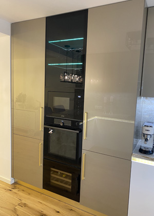 Použita jsou zde stejná akrylátová dvířka, tentokrát ozdobena vertikálními zlatými úchytkami. Uprostřed je černý elektro sloup, ve kterém jsou vizuálně skryty vestavěné spotřebiče. Nejníže se nachází vinotéka, nad ní trouba na pečení s možností připojení ovládání na telefon a výše mikrovlnná trouba značky Gorenje, zakončená prosklenou skříňkou na sklenice. Jednotlivé police z tmavého skla v odstínu Darky grey jsou osvětleny LED páskem. Díky možnosti měnit barvy osvětlení lze vytvářet různé atmosféry a efekty, které ještě zvýrazní krásu skla. Toto dynamické osvětlení tak mění obyčejnou skříňku na zážitek, kdy hra světel a stínů vytváří jedinečný okouzlující charakter.