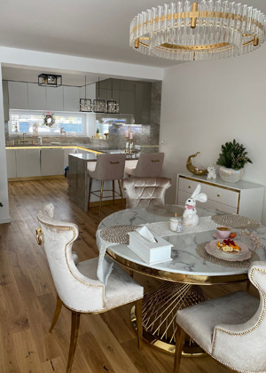 Kuchyňská linka je zakončena barovým pultem, který plynule navazuje kamennou deskou, pokračující z obou stran dolů až k podlaze. Bar je obložen bílým frézovaným panelem T.acrylic panelem, ladícím s kuchyňskými dvířky, a i zde je zlatý spodní lem. K němu náleží dvě barové židličky se zlatými nožičkami, čalouněné netradičním růžovým plyšem. Jídelní židle v art deco stylu jsou sladěny barevně s barovými, využívající opět zlaté kované zdobení, čímž jsou obě tyto části opticky propojeny. Stůl je taktéž v kombinaci zlata a kamene. Deska stolu je v dekoru bílo-šedého mramoru a noha stolu je ve zlatém spleteném kování. Mezi barem a jídelnou stojí bílá komoda se zlatými úchytkami a zlatým lemem, který se prolíná místností.