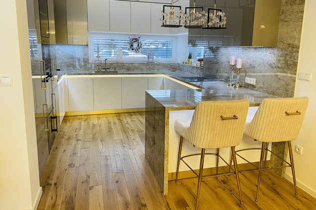 Pracovní deska kuchyňské linky je z kamene Dekton Taga - Stonika a povyšuje kuchyni na designově vysokou úroveň. Z tohoto materiálu je vyrobeno obložení, parapet, a dokonce i dřez. Díky danému provedení a materiálu se zde snižuje potřeba údržby spár a je vytvořen dojem jednotného designu. "Kamenné pracovní desky a dřezy jsou známé svou vysokou užitnou hodnotou, praktičností a odolností vůči poškození," vysvětluje Veronika Zlámalová z IMPRO nábytek. Dřezová baterie a dávkovač na mycí prostředek, ve zlaté barvě od BLANCO, dotváří celkový luxusní vzhled.