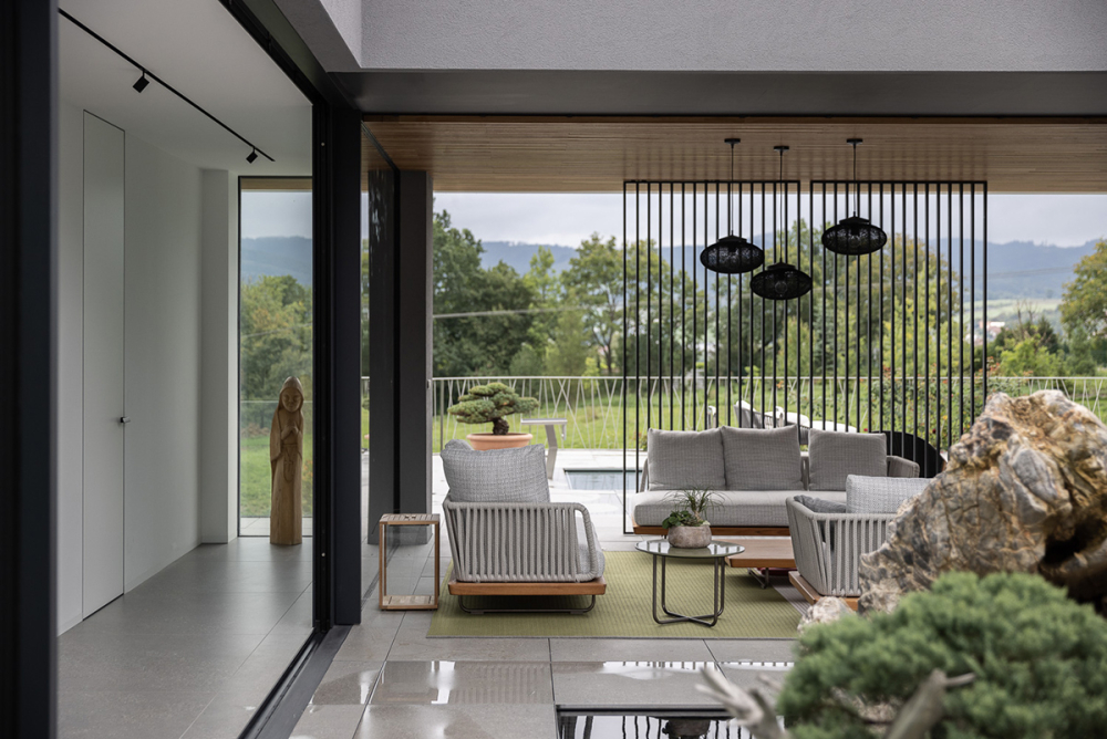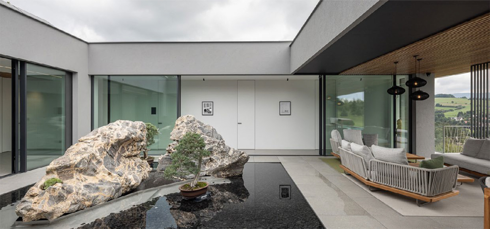 Hlavní atrium s půltunovými kameny a bonsajemi je srdcem domu