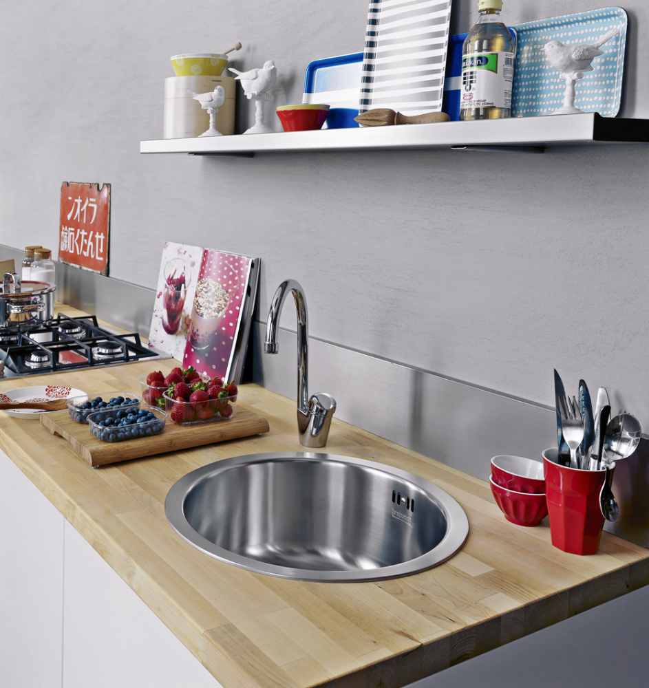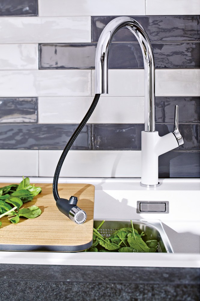 I když je kuchyň vybavená myčkou, bez dřezu se tu neobejdeme. Tento v minulosti ryze praktický doplněk má dnes v kuchyni společně s elegantní baterií i funkci estetickou.