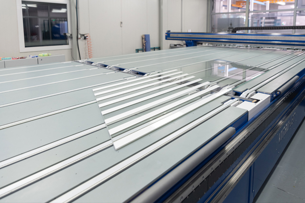 Dokonalým příkladem jsou digitálně potištěná skla. Při jejich výrobě se klade důraz na kvalitní přípravu tiskových dat, aby bylo dosaženo maximální ostrosti v detailu. Výrobní proces začíná aplikací keramických barev na skleněnou tabuli pomocí digitální tiskárny. Po sušení a vizuální kontrole následuje pečení barev do povrchu skla v kalicí peci při teplotě okolo 620 °C. Tato technika umožňuje tisknout na skla i s nepravidelnými tvary, která lze následně začlenit do různých typů vrstvených skel.