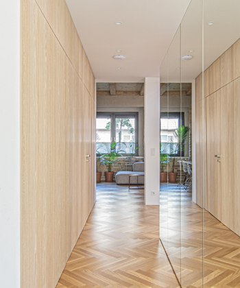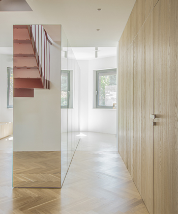 Vchod do domu je veden do prostoru obloukové přístavby. Zde se naproti dveřím nachází posezení, diskrétně oddělené rozložitou skříňovou sestavou se zrcadlovým povrchem. Ta zde plní standardní funkci úložného prostoru a zároveň důmyslně hradí přední část přízemí na úzký koridor vedoucí ke koupelně a kuchyňskému koutu. Zrcadlový povrch sestavy byl zvolen s jasným účelem, jak architekt vysvětluje: „Za největší hřích původních rekonstrukcí přístavby považuji umístění vstupu na jižní stranu, čímž se dostává denní zóna do pozadí na méně prosvětlenou stranu domu. Jelikož zde byl v rámci zadání i po mnoha debatách z technických důvodů požadavek na zachování vchodu v původní poloze, řešili jsme otázku, jak do prostředí dostat co nejvíce jižního slunce. Vznikla tak zrcadlová stěna, která prostor prosvětluje a velmi decentně rozčleňuje.“
