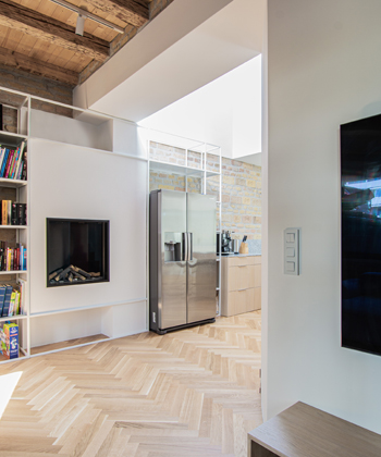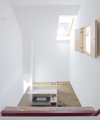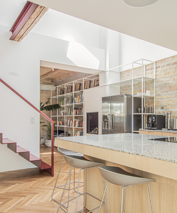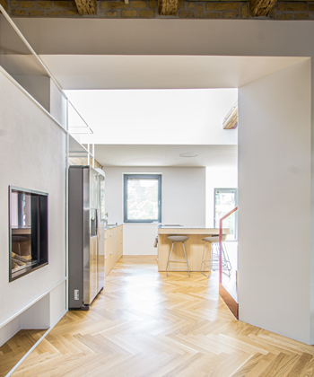Jedním z hlavních cílů rekonstrukce dvoupodlažního domu bylo maximální propojení prostoru s eliminací zbytečných bariér. „Centrální obytný prostor je organizovaný okolo schodiště a kuchyně, která se nachází napravo od zrcadlové stěny, a otevírá se do galerie. Kuchyně se tak stává bodem, který spojuje jednotlivé prostory v horizontálním i vertikálním směru,“ popisuje Marián Gombarček. Nad pracovní deskou otevřeného kuchyňského koutu je k vidění první ze zachovaných cihlových zdí, která je však odhalena pouze do úrovně stropu a její hrana tak funguje jako přirozený předěl pod prostorem galerie. Galerie zde díky čistým bílým plochám a střešnímu oknu plní funkci nositelky světla a účinně provzdušňuje střed stavby, který by kvůli kumulaci hmoty a vizuálně dominantnímu schodišti od firmy KONTECH a kovové traverze v jasně červené barvě mohl narušovat kýžený vzdušný efekt. Zajímavý prvek na pomezí kuchyně a obývacího pokoje pak představuje zkosená stěna. Její úprava byla, stejně jako změna tvaru schodiště a odstranění přilehlých příček, provedena právě v průběhu této rekonstrukce. „Zkosení stěny reaguje na požadavek o co největší vizuální propojení obývacího pokoje a kuchyně bez toho, abychom ubírali z prostoru schodiště,“ objasňuje architekt Gombarček.