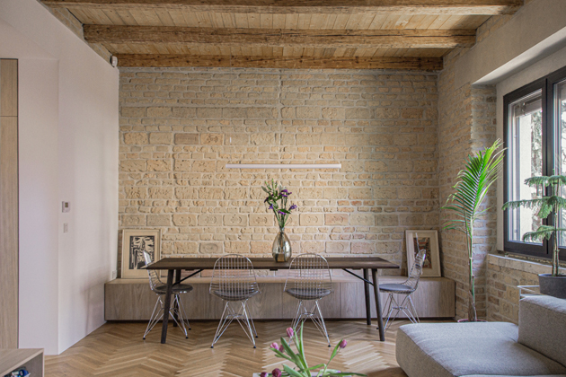 Největší místností v přízemí je obývací pokoj s jídelnou. Právě tady se v nejvyšší míře prolínají stopy současnosti a dob dávno minulých, které zde ztělesňují obnažené obvodové zdi, původní okna a rustikální trámový strop. Syrovou krásu cihel a letitého dřeva nechává vyniknout absence závěsných dekorací a umírněné barvy nábytku v odstínech bílé, šedé a hnědé. Po pravé straně vstupu se nachází krb, důmyslně vsazený do prosté bílé plochy, která opticky navazuje na stejnobarevnou příčku a pomáhá propojit světlý prostor galerie s výraznými komponenty obývacího pokoje. Minimalistická plocha s krbem je pak z obou stran doplněna subtilní bílou konstrukcí, jejíž linie bez zadní stěny umožňují prohlédnutí až k cihlové zdi. Neotřelým elementem je tu potom osvětlení. To je nenápadně zasazené mezi stropní trámy či linie zdi, designová perlička v podobě kruhového lustru však jen podtrhuje ideu propojení historie a moderny a dodává místu zasloužený punc jedinečnosti.
