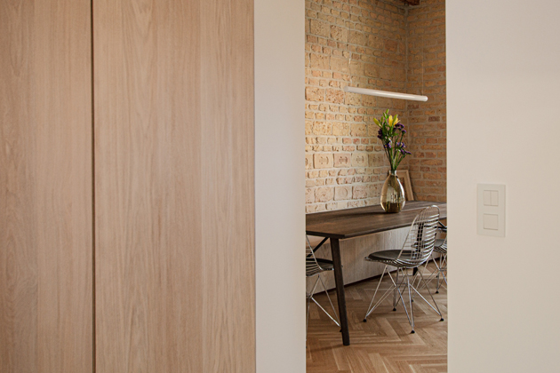 Nalevo od hlavního vstupu můžeme nalézt malou technickou místnost, na kterou navazuje oddělené WC. Právě to je v záměrně propojeném prostředí přízemí jedinou výjimkou, která kvůli zachování soukromí disponuje interiérovými dveřmi. I ty však zachovávají nastavený ráz interiéru. Povrch dveří je vyveden ve stejném dřevodekoru, jako okolní plochy, a díky variantě se skrytou zárubní není průchod zatížen zbytečnými rušivými liniemi. Nenápadnost ve spojení s funkčností a kvalitou byla uplatněna také při výběru dveřního kování. Dveře jsou vybavené klikou MINIMAL z dílny české rodinné manufaktury M&T, pro níž byla zvolena z osmnácti dostupných povrchových úprav barevně ladící varianta broušeného niklu. „Kování jsme vybírali na základě vzhledu a kliky MINIMAL jsme zvolili pro jejich čistý, minimalistický design,“ popisuje Marián Gombarček. Právě autorský design a vysoká kvalita jsou pro M&T, jediného českého výrobce designového dveřního a okenního kování a lídra v oblasti jeho povrchových úprav, prioritní. „Kliky MINIMAL plně vyhovují požadavkům minimalistického interiéru, a to zejména díky skryté rozetě nepřesahující jejich obrys. Jejich výjimečnost pak spočívá také ve variabilitě, kterou nabízí – jednak z pohledu rozmanitých povrchových úprav a jednak uceleností kolekce, ve které lze najít kliky pro všechny typy oken a dveří ve stejném designu,“ doplňuje Roman Ulich, hlavní designér společnosti M&T.