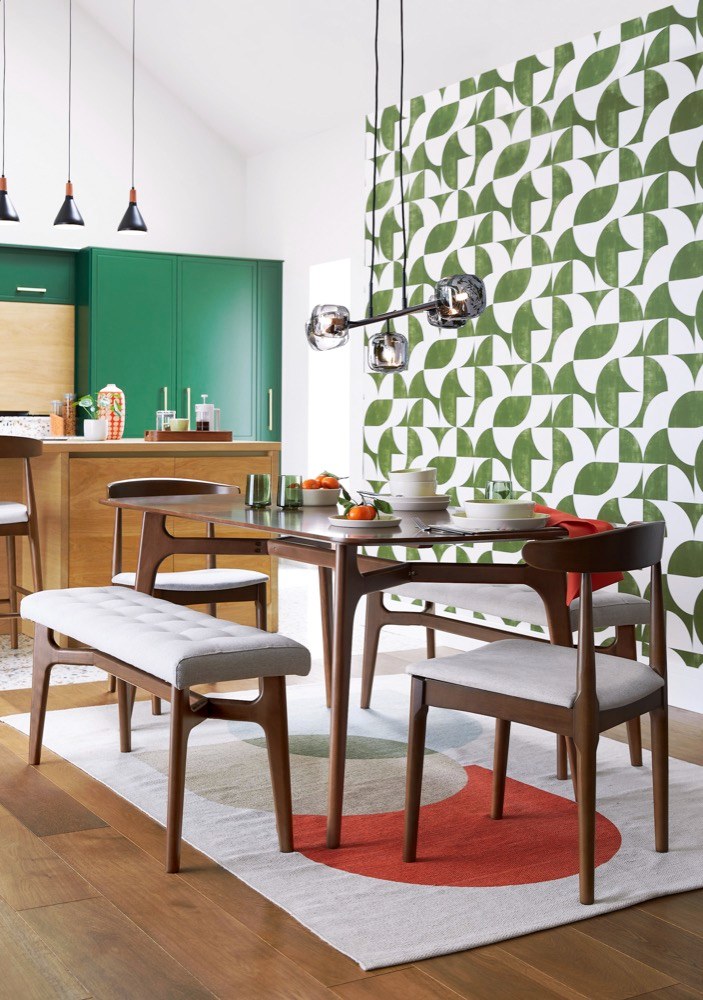Zelenkavá barva v jídelně je možná pro odvážnější, ale jak vidno, bát se jí rozhodně nemusíte. A pokud ji vhodně doplníte teplou barvou, bude se vám v ní i velmi dobře stolovat. Zajímavostí této barvy je kromě jiného také fakt, že nepohlcuje ani neodráží světlo. Tudíž jídelnu sama od sebe opticky sice nezvětší, ale ani nezmenší.