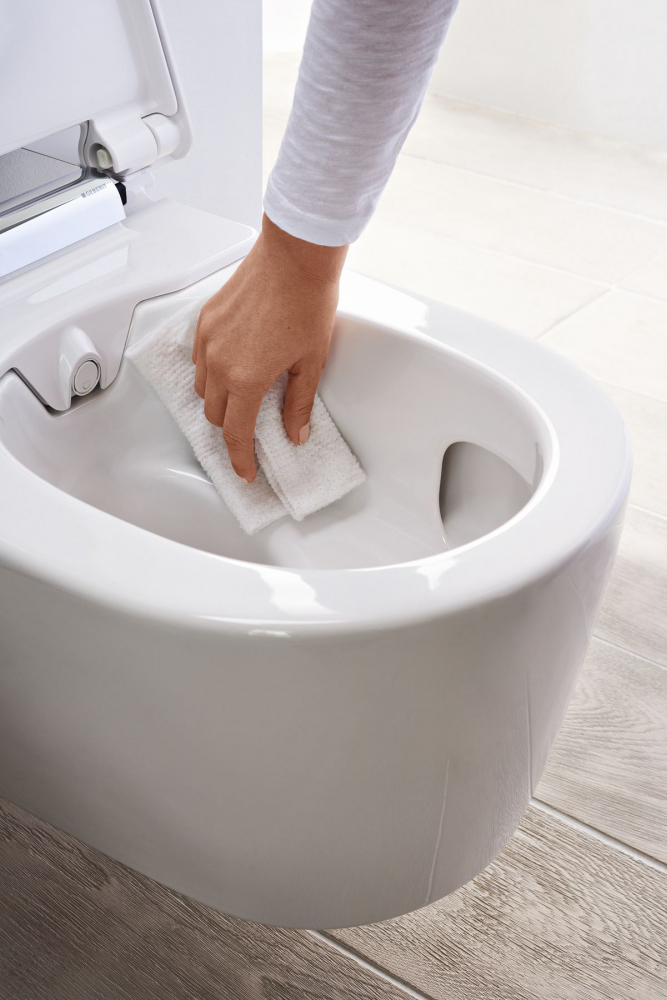 Jednoduché čištění WC mísy bez splachovacího kruhu (vlevo) a jednoduché odnímání WC krytu a sedátka.