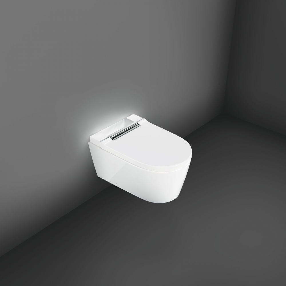 Geberit AquaClean Sela s chromovým krytem (vlevo) a Geberit AquaClean Sela orientační světlo.