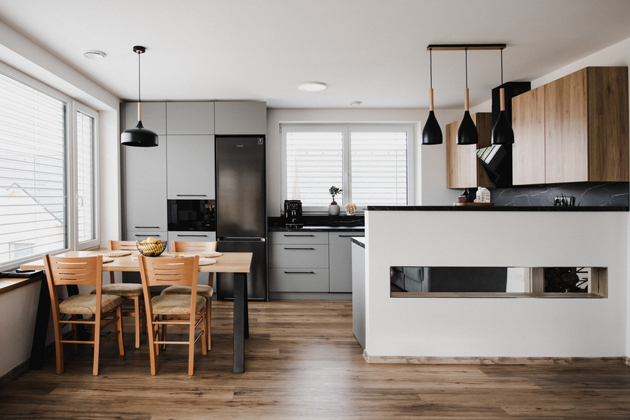 Významnou roli v této kuchyni hraje i světlo. Všechny tři barevné motivy – černou, šedou a dřevodekor, efektně tříští široké plochy oken, které vnáší do prostoru dostatek světla, čímž ho opticky rozšiřují a provzdušňují. Horní skříňky jsou zespodu, stejně jako barová příčka, vybaveny LED osvětlením, které kuchyni zajišťuje útulný a romantický nádech. Design místa potom doplňují minimalistická oblá světla, umístěná nad barem a jídelním stolem.