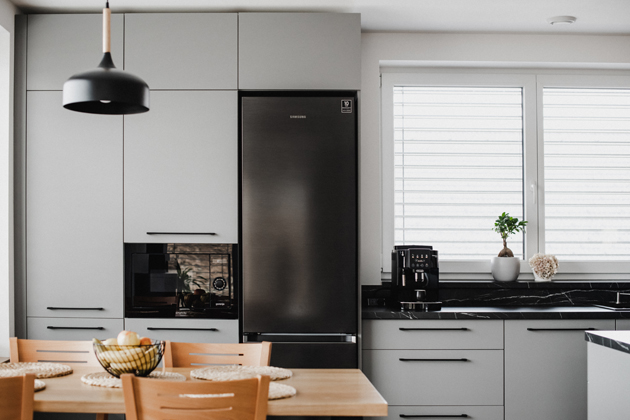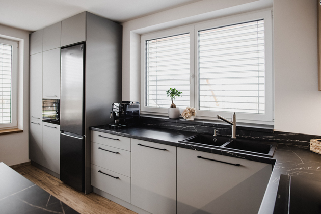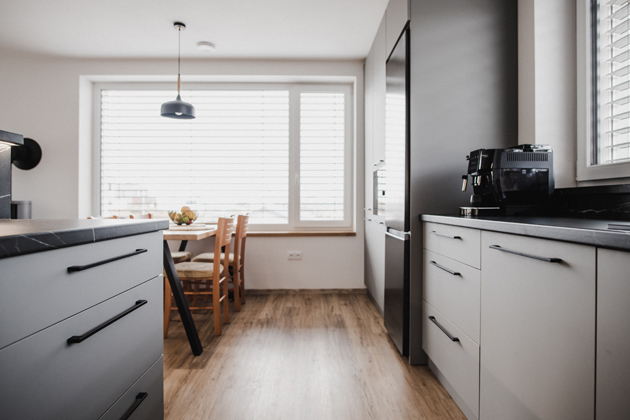 Z pohledu materiálů byla zvolena akrylátová dvířka T.acrylic v popelavě šedém matu od společnosti Trachea. „S nábytkovými dvířky Trachea máme dlouholeté pozitivní zkušenosti,“ uvádí Markéta Havlíková z truhlářství F-HANET, a pokračuje: “Nejenže u nich najdeme opravdu široký sortiment, takže v interiéru nejsme z pohledu materiálů na nábytek ničím omezeni, ale navíc se setkáváme s velkou vstřícností při řešení jakýchkoli dodávek.“ Materiál T.acrylic má svůj akrylátový povrch odolný vůči teplu i vlhkosti a je díky tomu velmi vhodný právě do náročného prostředí kuchyně. „Při výběru nábytku do míst se zvýšenou vzdušnou vlhkostí je důležité věnovat pozornost zpracování nábytkových hran. Při jejich nekvalitním provedení by totiž časem mohl nábytek působením vlhkosti nabobtnat. Proto by dnes již mělo být standardem použití PUR lepidel, které si zachovávají své vlastnosti i při vyšších teplotách,“ popisuje Martin Dusík, obchodní ředitel společnosti Trachea, největšího českého výrobce nábytkových dvířek a panelů, a vysvětluje: „Spolehlivým ukazatelem kvalitního ohranění dvířek je síla spáry mezi hranou a plochou nábytku. Pokud výrobce použije hodně lepidla nebo nedodrží správný výrobní postup, jsou spáry hodně viditelné. Jednou z výhod PUR lepidla je, že ho stačí použít pouze malé množství, takže hrana těšně přiléhá ke dvířkům, čímž vzniká minimalistická tenká spára.“ Dalšími výhodami dvířek T.acrylic v matné úpravě je také jejich rezistence vůči otiskům prstů či UV stabilní povrch, díky němuž si i po letech zachovají původní syté barvy.
