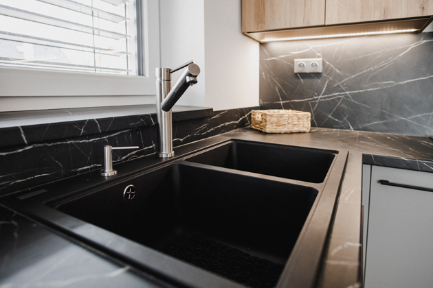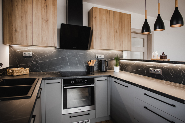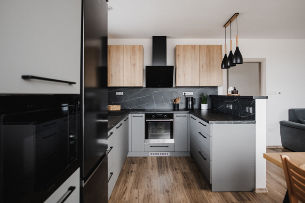 Kuchyň má tvar písmene U, na jedné straně protáhlého po celé délce zdi. Střídá se zde neutrální šedá barevnost skříněk s tmavou imitací mramoru a hřejivým motivem dubu, použitém na vrchních skříňkách a drobných doplňcích. Pro pracovní desku, umístěnou ve výšce devadesát centimetrů, byla zvolena imitace černého mramoru s bílým žilkováním. Tento motiv se objevuje také na desce barového pultu a obkladech tří kuchyňských stěn, kde plní nejen roli ochrannou, ale také designovou. Skvěle se navíc doplňuje s granitovým dvojdřezem Franke, černými úchytkami skříněk, světly a kuchyňskými spotřebiči. O dominantní roli se v kuchyni uchází také praktická šedá na spodních skříňkách. Díky použití jemného popelavého odstínu nepůsobí rušivě ani na velké ploše a pomáhá nenásilně propojit černou s kontrastní bílou a dřevitými motivy, použitými na podlaze a horních skříňkách.