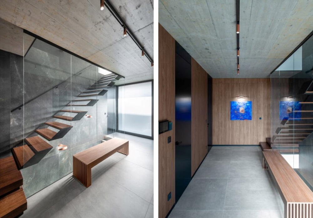 Andrej Gajdoš upozorňuje na originalitu při vstupu do domu: „Jde o pohled na plovoucí konzolové schodiště, které je ústředním bodem tohoto prostoru a lze ho vnímat téměř jako sochařský prvek. Schodiště BOX navíc svou kvalitou ergonomického designu, který společně JAP FUTURE a SAGA doladily pro tento projekt, zapadá do dynamiky prostoru vstupu a chodby.“ Je složeno z jednotlivých svařovaných boxů, odtud název, a v tomto konkrétním případě jsou boxy v antracitové barvě. Nášlapné stupně jsou dřevěné a zábradlí supluje skleněná stěna až ke stropu. Výsledkem je moderní schodiště působící lehkým dojmem.