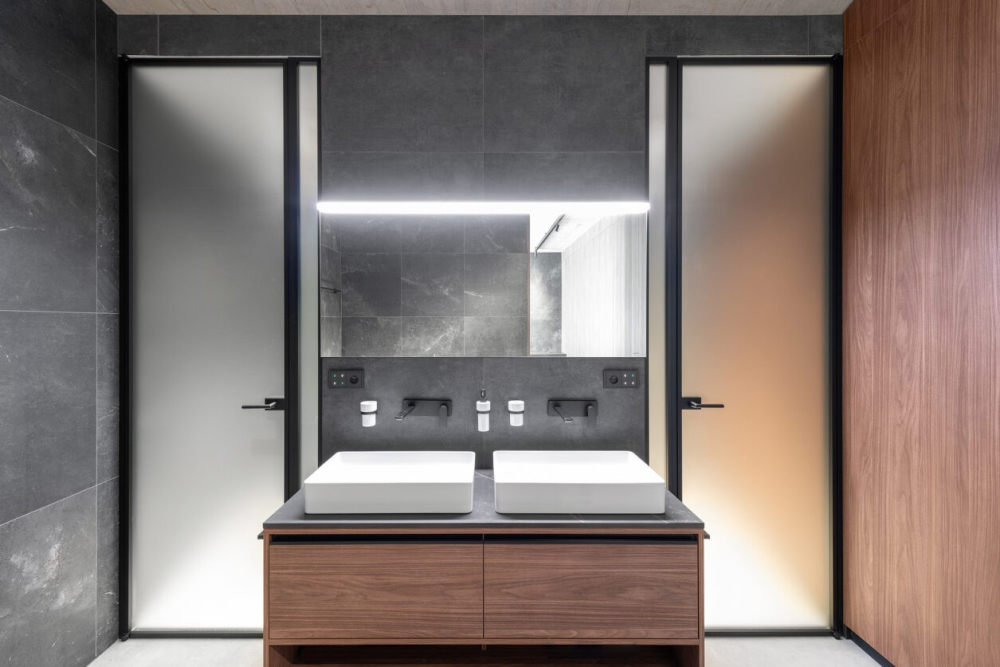 Velkorysá koupelna ve druhém patře domu je propojena s ložnicí bez jakékoli bariéry, čímž vznikl kompletně otevřený prostor. Zvolené prostorové řešení umožňuje pocitově plynulejší pohyb. To je navíc zdůrazněno použitím skleněných dveří pro vstup do sprchy a toalety. I zde je použita kombinace dekoru dřeva a velkoformátových kamenných obkladů, což je charakteristický a sjednocující prvek celého domu.