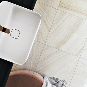 Dlažba Onyx (RAKO), imitace leštěného onyxu, 60 × 60 cm, cena 1 387 Kč/m2, www.koupelny-ptacek.cz