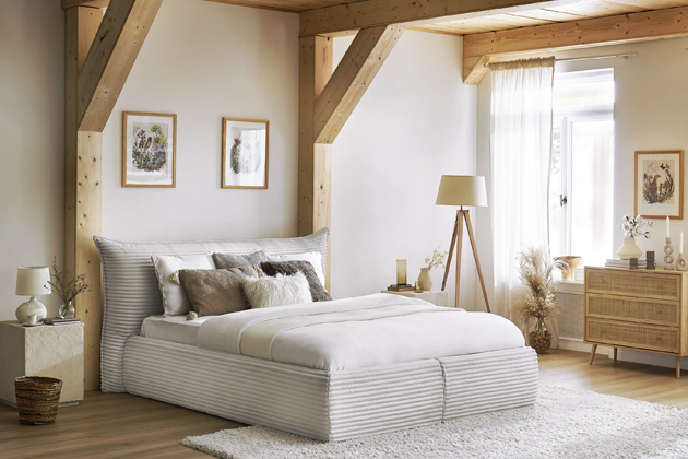 Jestli potřebujete do ložnice dostat pocit většího tepla a zútulnit ji, prozkoumejte nabídku čalouněných postelí. Čalouněné může být jen čelo, nebo je postel „oblečená“ i po celém obvodu. Kvůli životnosti ověřte kvalitu látky a zeptejte se na možnost čištění. Většinou máte na výběr i více druhů látek či kůží.