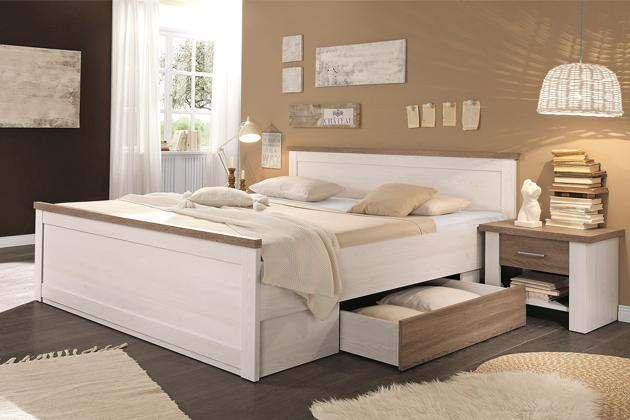 Postel Luca s nočními stolky a úložnými zásuvkami, bělená pinie, 180 × 200 cm, cena 9 999 Kč, www.asko.cz