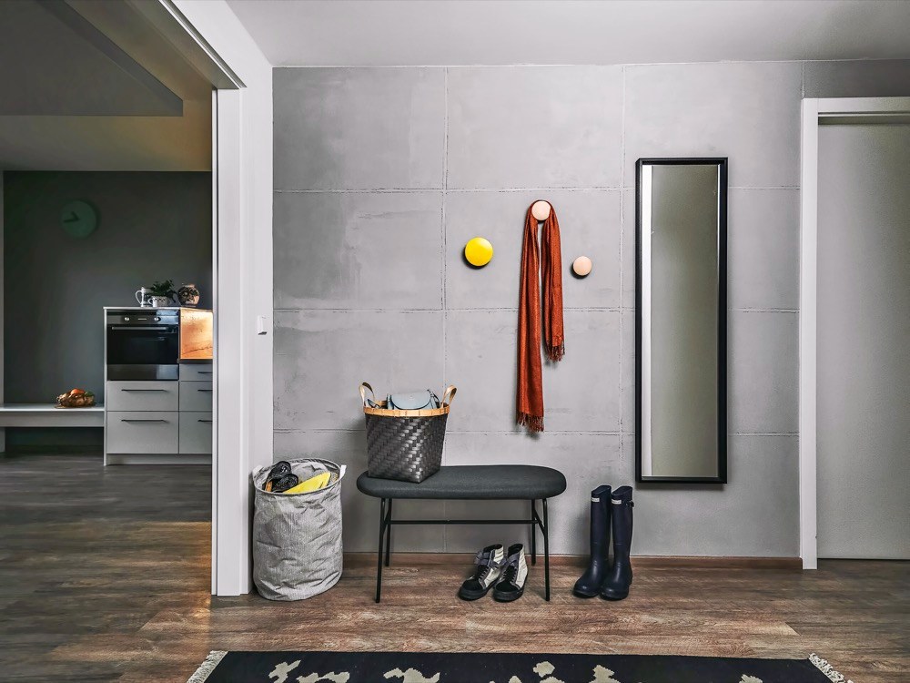 Když v interiéru použijete na zdi dekor betonu, snažte se ho doplnit hřejivými materiály.