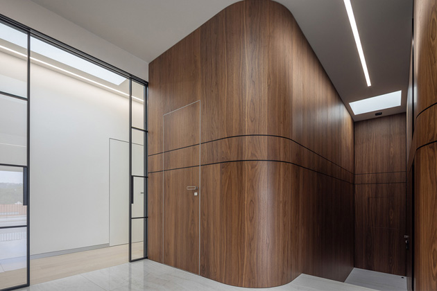 Díky velkému množství střešních světlíků je byt sám o sobě velmi světlý. „Mohla jsem si tedy dovolit použít tmavší ořechové dřevo, které má krásnou jemnou kresbu. Na kmen, který by byl dostatečně velký a vhodný, abychom z něj vyrobili obklad pro celou chodbu, jsme však čekali několik měsíců,“ upřesňuje architektka, paní Vendula Gazo Jelínková. Trpělivost opět potvrdila, že přináší růže, protože díky ní se zajistila návaznost kresby i jednotná barva dýhy.