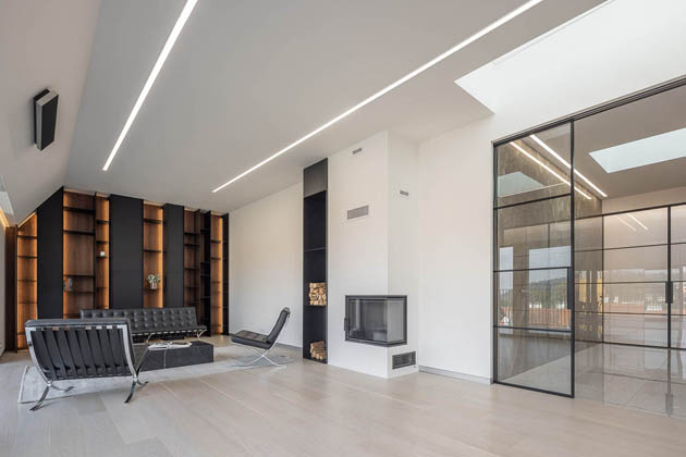 Výraznými prvky obývacího prostoru se staly jednoznačně velká knihovna a krb. Záda knihovny jsou vyrobena ze stejné ořechové dýhy jako obklad v předsíni. Její kresba je zvýrazněna vertikálními LED pásky. Černé kontrastní stojky jsou z tenkého laminátu, aby bylo dosaženo subtilního efektu a zkopírování efektu tenké stěny kovu u krbové niky. Zároveň se podařilo integrovat i uzavřené úložné prostory.