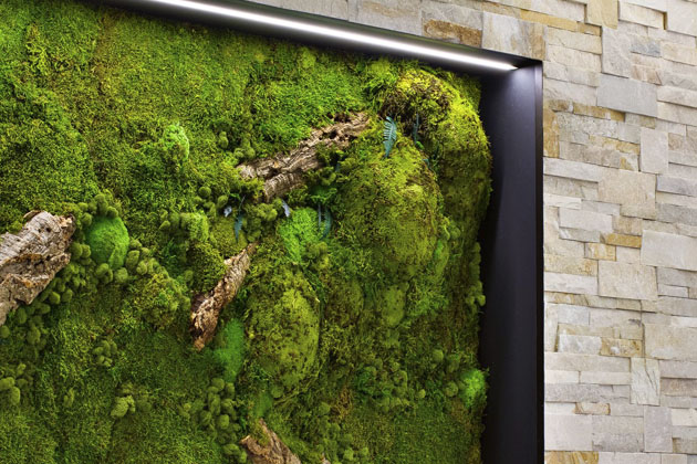 Mechové dekorace navodí v interiéru pocit pohody a sounáležitosti s přírodou. Navíc, jak známo, zelená barva uklidňuje a snižuje stres.