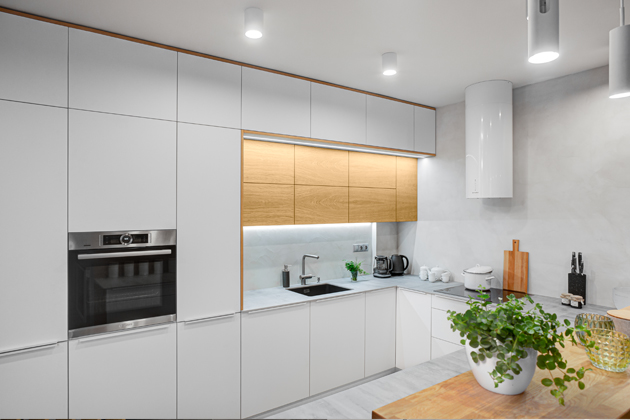 v podobě modrého polštáře na sedačce, který celkový prostor zvýrazňuje. Prostor vlevo je vyčleněn k vaření a stolování. Kuchyň kombinuje dubový masiv a bílý ultra mat, jídelní stůl je rovněž v kombinaci bílé barvy s dubem.