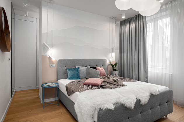 Ložnice je vybavena manželskou postelí v šedém čalounění. Černé detaily tam vystřídaly barevné polštářky a modré noční stolky hrající do noty abstraktní tapetě na stěně s motivem siluet hor.