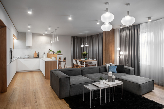 Na chodbu navazuje obývák spojený s kuchyňským a jídelním koutem. K odpočinku vybízí pohodlná tmavě šedá sedačka.