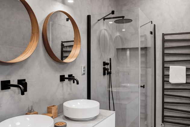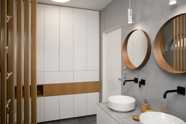 V koupelně dominuje šedá barva betonové stěrky. Decentně ji doplňuje bílý nábytek, o černý akcent se starají baterie. Teplo do prostoru přinášejí kulatá zrcadla s dřevěným rámem.