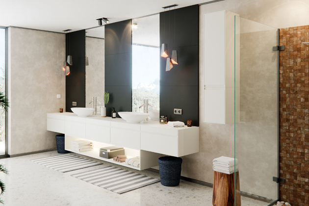 Koupelnové stěny se už dávno neomezují pouze na klasické keramické obklady. Moderní záležitostí jsou velkoformátové obklady z plošných nábytkových materiálů, které skvěle plní funkci jak designovou, tak i praktickou. Díky hladkému povrchu beze spár a kvalitnímu provedení jsou téměř bezúdržbové a odolné vůči vlhkosti.