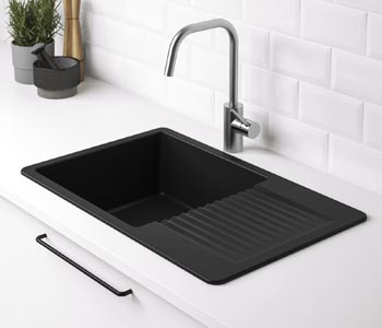 Vestavný dřez s odkapávačem Kilsviken (Ikea), kompozitní materiál, 72 × 46 cm, cena 5 490 Kč, www.ikea.cz