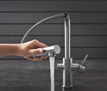 Dřezové baterie Grohe mohou být doplněny systémem Grohe Blue Home, který dokáže po stisknutí tlačítka zajistit dávkování chlazené, filtrované, případně i perlivé vody přímo z baterie. Vedení filtrované vody je od běžné vody oddělené, více na www.grohe.cz