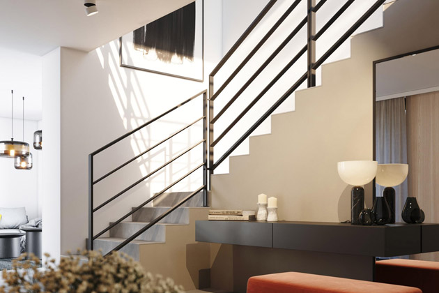 Minimalistickému modernímu pojetí interiéru vycházejí vstříc zábradlí, která nijak neslevují z bezpečnostního hlediska, ale není na nich nic nadbytečného. „Prostá, nadčasová, jednoduchá konstrukce, která přirozeně splývá s ostatními interiérovými prvky ve stejném duchu, má dnes zelenou. Je to požadavek bytových architektů a designérů, kterému se snažíme přizpůsobit,“ vysvětluje Petr Paksi, jednatel firmy JAP FUTURE.
