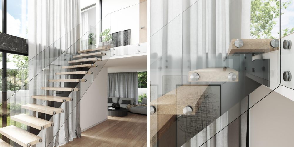 Zábradlí TRANSPARENT – lepená kalená skla se kotví z boku schodiště na tzv. nerezové puky
