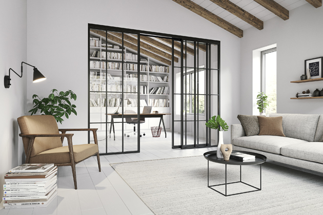 Posuvné loftové dveře v industriálním stylu (Hörmann) kombinují černý ocelový rám s prosklenými plochami, www.hormann.cz