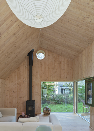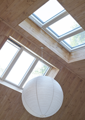 Foto: VeluxPřestože hlavní koncept návrhu zůstal nedotčen, během výstavby došlo i na úpravy. Christoffer si uvědomil, že chce prosklený roh obývacího pokoje, který by do interiéru pustil paprsky slunečního světla kromě shora i z jihozápadu. A přibylo i malé kulaté okénko vysoko ve štítu, které nechává sluneční paprsek putovat po stěnách jako sluneční hodiny. "Kulatá okna se mi líbí, vyvažují racionálnější aspekty návrhu. Byla pro mě výzvou k instalaci, protože jsem s kulatými okny nikdy předtím nepracoval," pokračuje Christoffer.