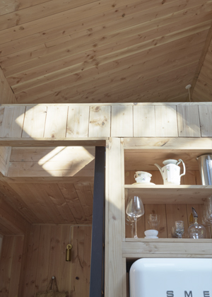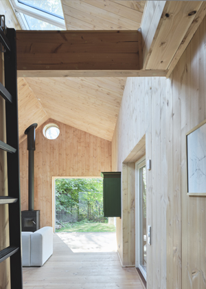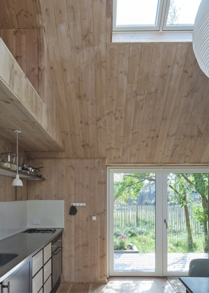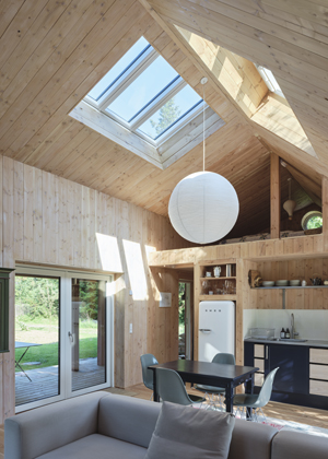 Hlavní budova má samozřejmě v koupelně bojler na teplou vodu. Je vytápěna kamny na dřevo a elektrickým podlahovým topením. Navzdory svým malým rozměrům jsou kamna na dřevo velmi výhřevná a Majken a Christoffer otevírají i střešní okna, aby místnost účinně vyvětrali. "Chtěli jsme v hlavní budově dostatek denního světla a vidět oblohu a koruny stromů. Střešní okna VELUX byla jasná volba. Rozhodl jsem se pro menší formát řady 3v1 se třemi samostatnými křídly v jediném rámu. Střešní okna jsou dálkově ovládaná, zavírají se automaticky, když prší, a fungují na solární pohon, takže není potřeba kabeláž," chválí Christoffer.