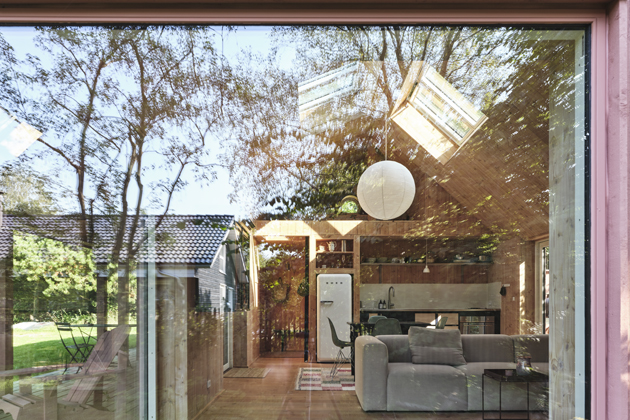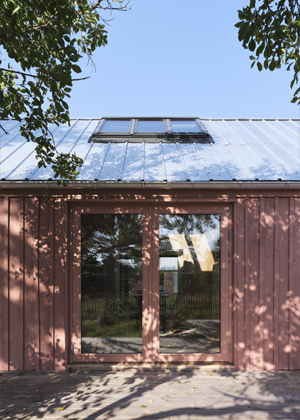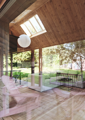 Na místo jednoho velkého domu, který by pozemku dominoval, s architektem vymysleli komplex tří budov (hlavní dům, chata pro hosty a skleník). Domky žijí v symbióze s okolním lesem a přírodou, s níž jsou velkoryse propojeny průhlednými stěnami i střechou. "Chtěli jsme v hlavní budově dostatek denního světla a vidět oblohu a koruny stromů,“ vysvětluje majitel, proč do střechy zasadil hned dvě „trojitá“ okna VELUX 3v1.