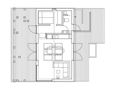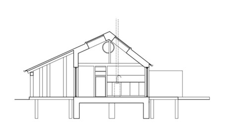 Foto: VeluxPříčný řez středem hlavní budovy. Dvě střešní okna VELUX 3v1 jsou umístěna v blízkosti hřebene, nad jídelním stolem. Dvoje francouzské dveře spojují přes interiér přední terasu se zadní krytou verandou.