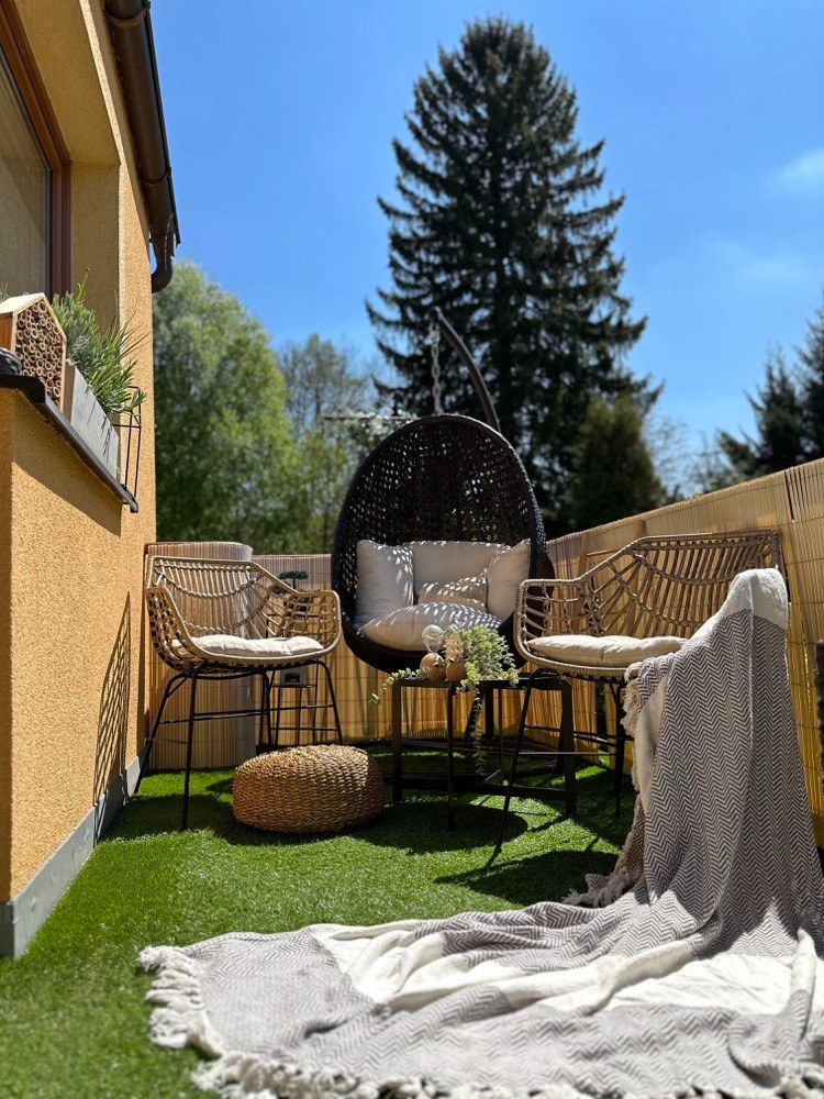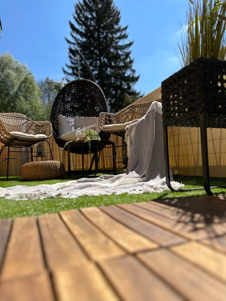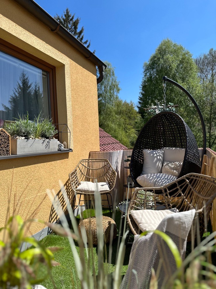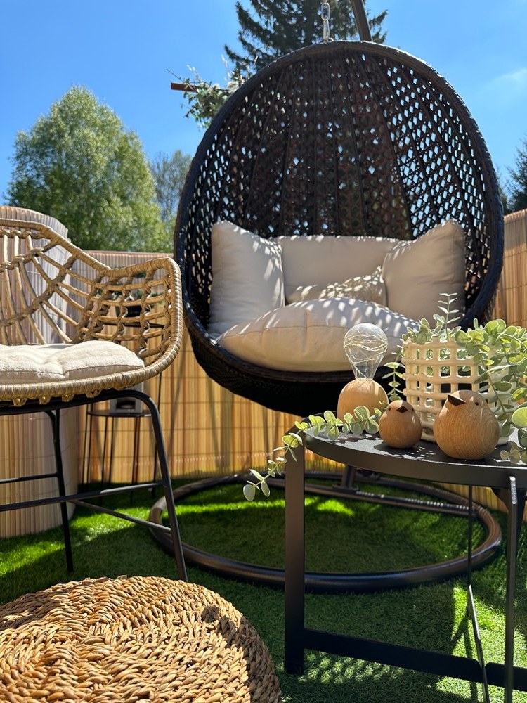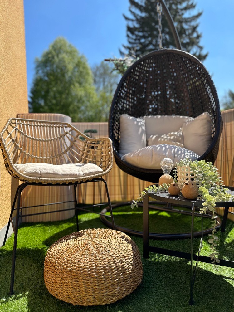 Houpačku ve tvaru vajíčka, která se dříve nacházela na straně vířivky, jsem přesunula do druhého rohu a doplnila ji o dvě venkovní ratanové židle s tmavým minimalistickým stolkem.