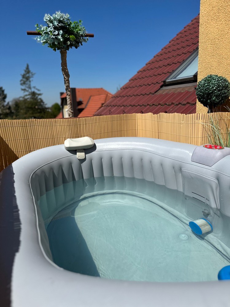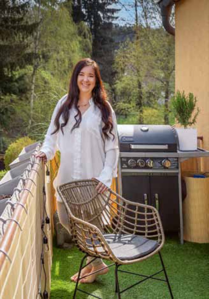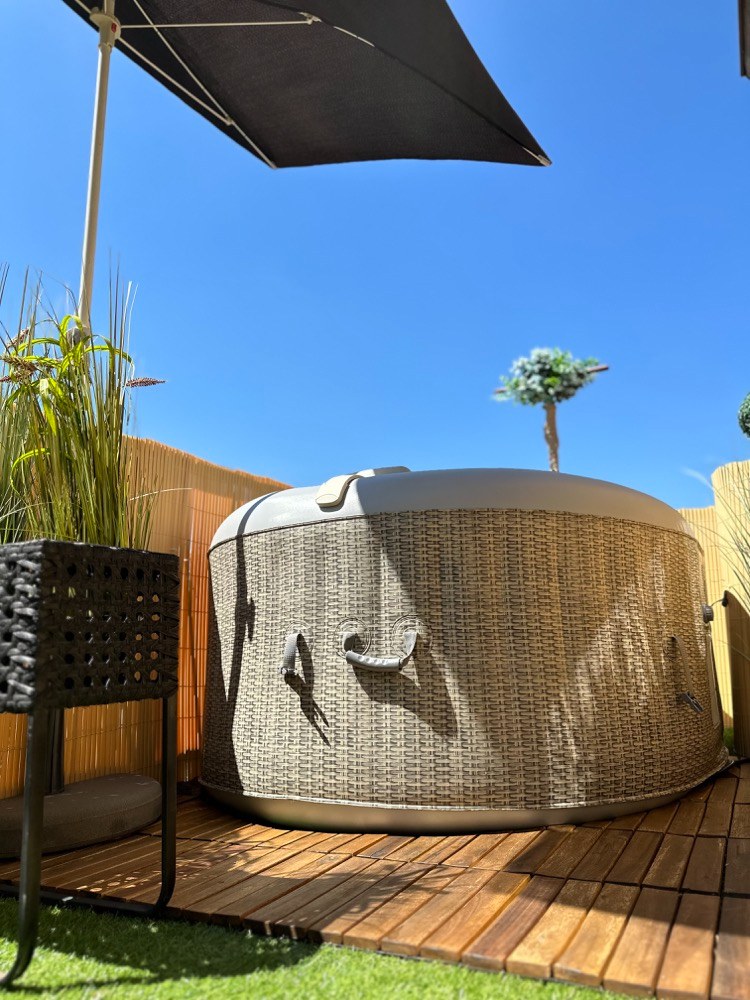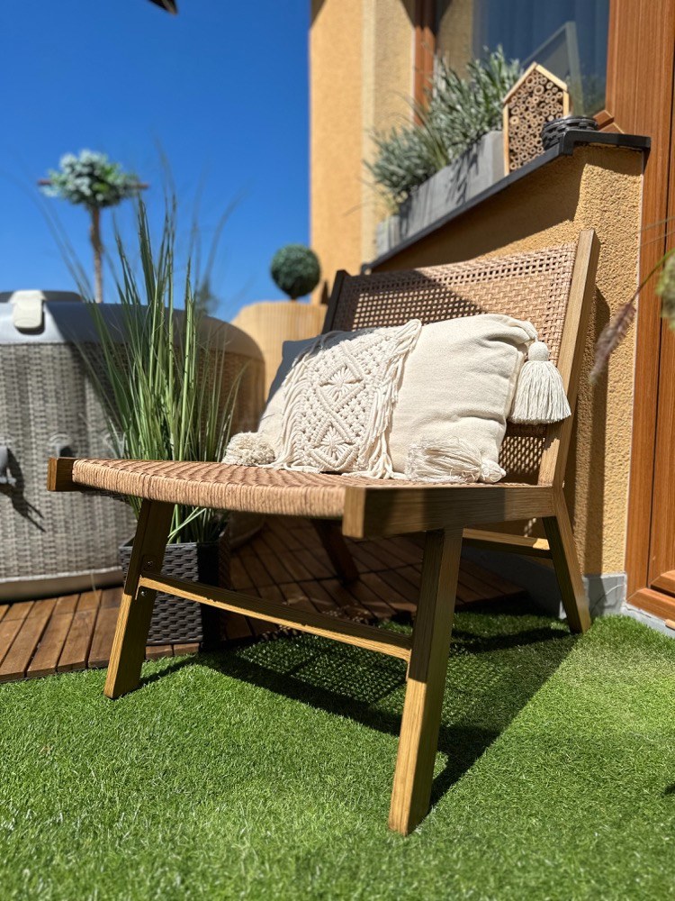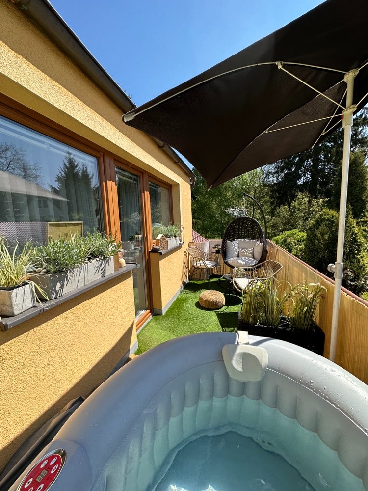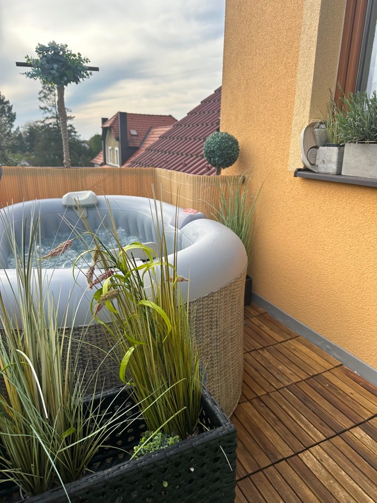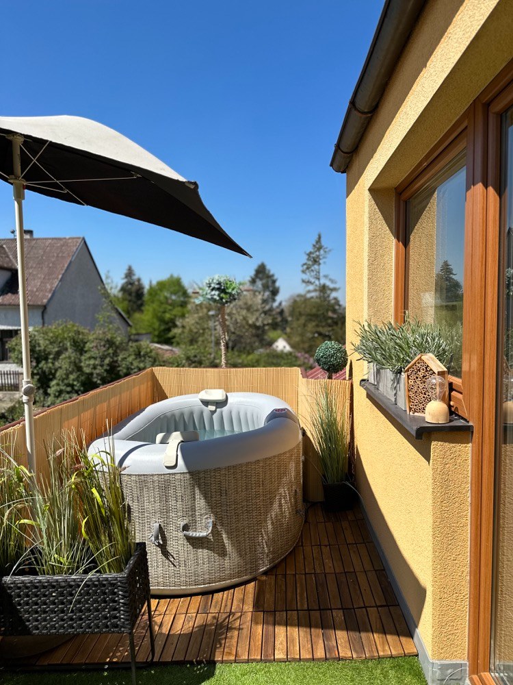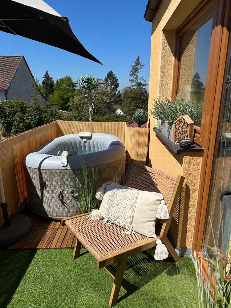 Jednou z novinek je vířivka pro dva, ve které se můžeme příjemně zchladit nebo naopak vodu ohřát a spolu s bublinkami si užít příjemnou relaxaci. Při koupi jsem se zaměřovala na malé provedení, aby po naplnění vodou nebyl balkon přetížený. Vířivka váží tedy pouhých 500 kg a díky svému tvaru ji lze snadno umístit do rohu i malých prostorů. Zvolila jsem ratanový potisk, který místu dodává příjemný teplý nádech a zároveň se krásně doplňuje s ratanovými židlemi.