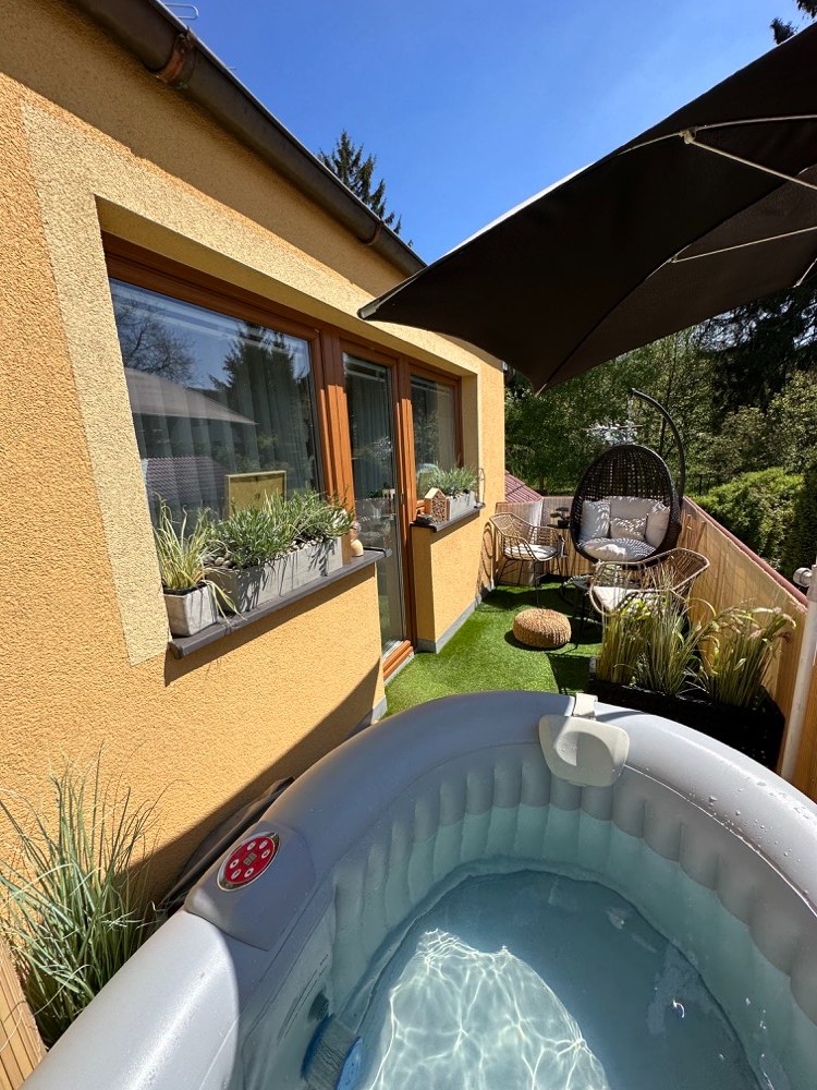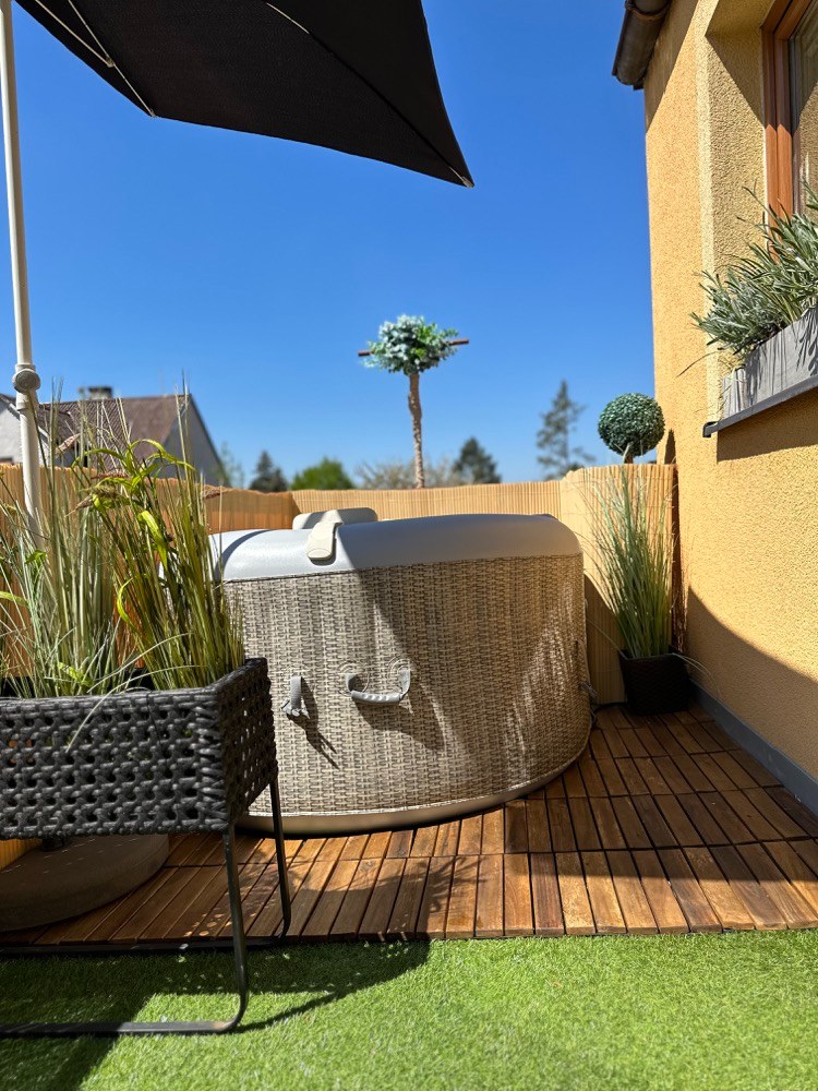 Její okolí jsme obložili dřevem z akácie, které jsme vyřezali tak, aby do sebe s vířivkou dokonale zapadalo a působilo uceleným dojmem. Celý kout jsem zútulnila slunečníkem, kterým lze podle potřeby libovolně pohybovat ze strany na stranu.