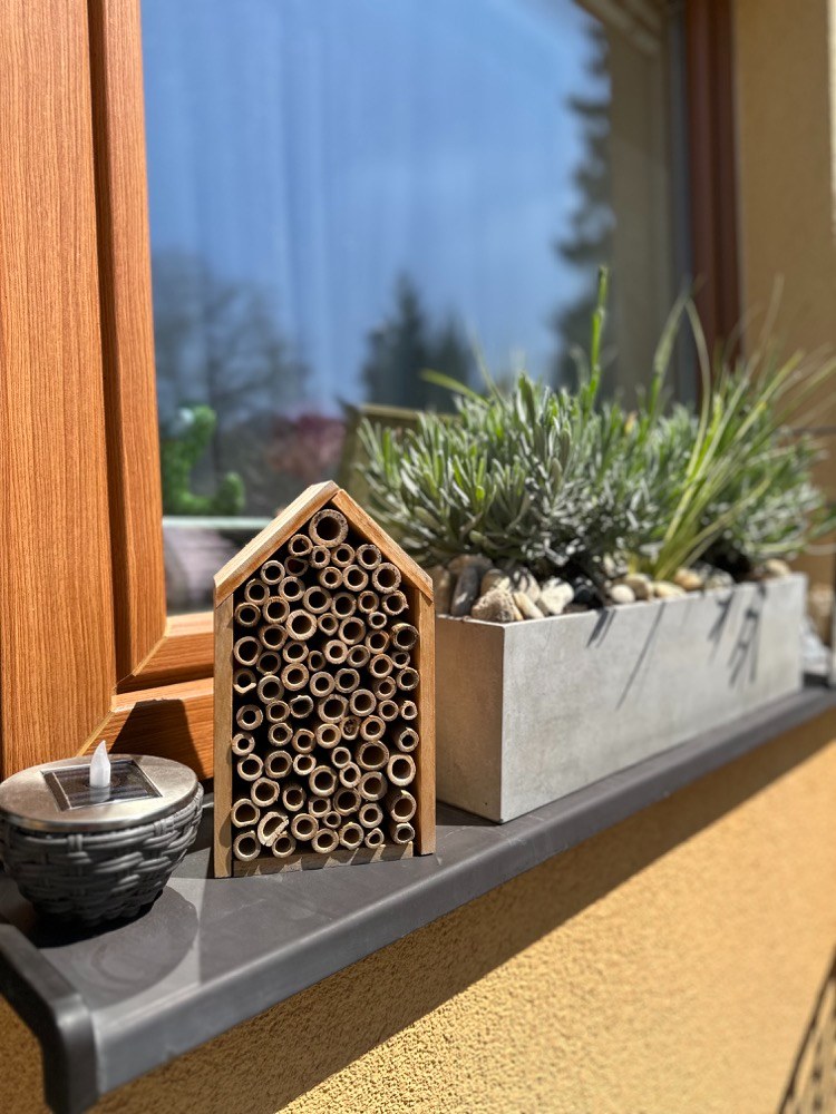 No a nakonec, aby bylo co pozorovat, jsem na parapet umístila i hmyzí domečky, které jsou útočištěm pro prolétající hmyz, který ráda pozoruje i naše dcera.
