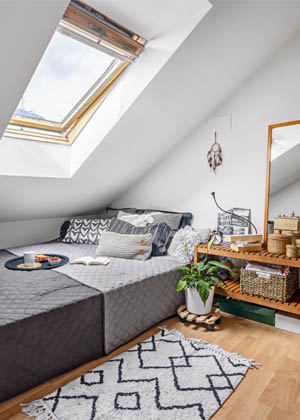 Když jsem si byt pořídila, pracovala jsem na Primě, kde jsem poznala designérku Kamilu Douděrovou a požádala ji o pomoc. Nechtěla jsem žádné velké úpravy, spíše mi šlo o nějaký nápad. Kamila mi pár nápadů vnukla, třeba kde by bylo dobré mít sedačku, a doporučila mi i stříbrné minimalistické hodiny a černobílé fotografie. Také mi doporučila umístit postel pod šikminu. Původně jsem chtěla mít postel v rohu a nevěděla jsem si rady s jejím čelem. Nakonec jsme se s Kamilou shodly na tom, že postel čelo mít vůbec nemusí, že to vyřeší polštáře. Jsou to rady, které v bytě dobře fungují.