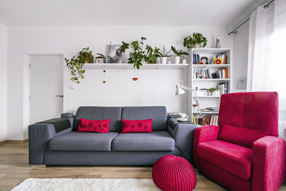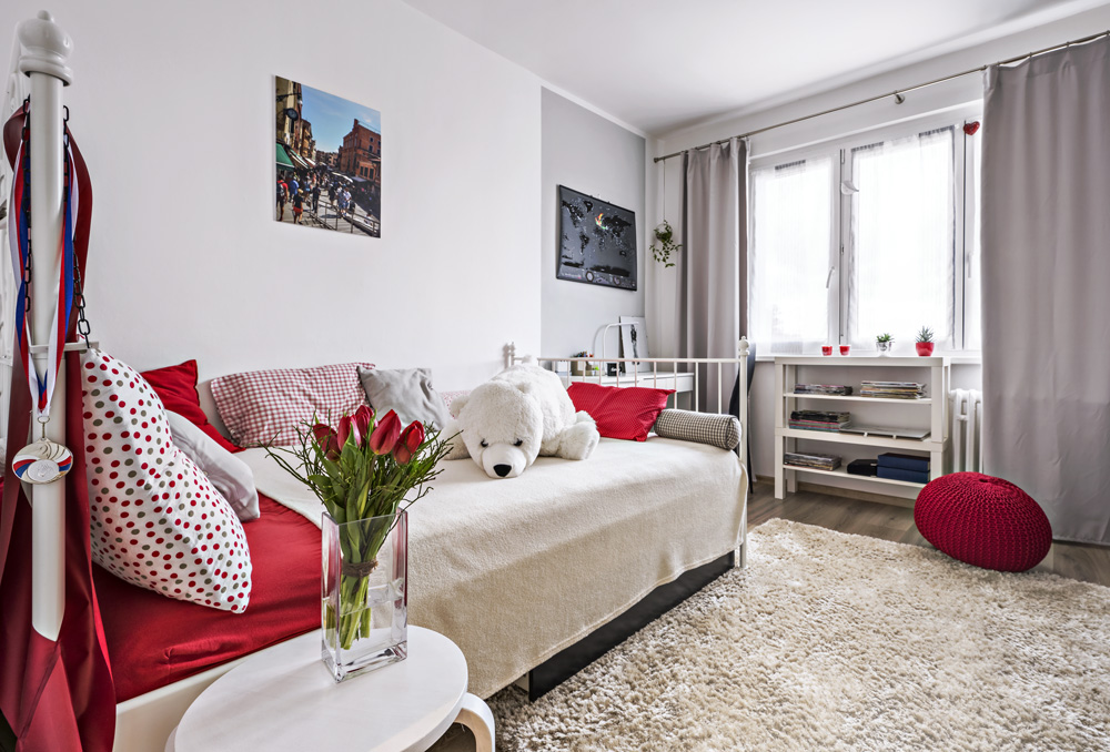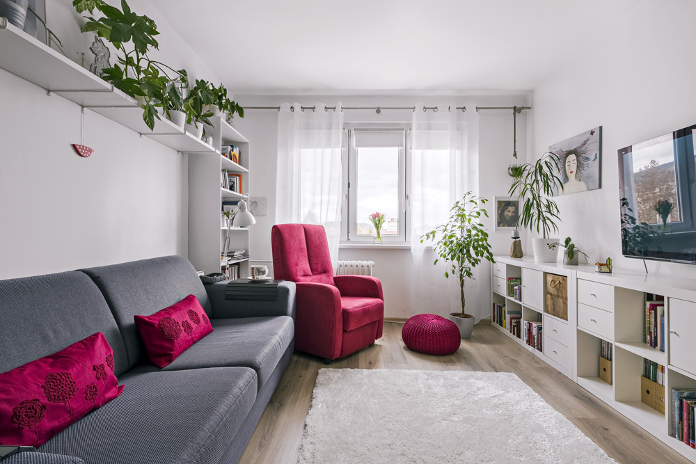 Design bytu se klubal postupně a dá se říci, že během dvou let, kdy ho majitelky obývají, se ještě stále klube. Barevný koncept byl jasný – bílá je nadčasová, čistá a dobře se kombinuje. Červené doplňky bílou rozsvítí a Renča ji má ráda. Laminátové a vinylové podlahy s dekorem dřeva dodají do interiéru teplo a útulno.