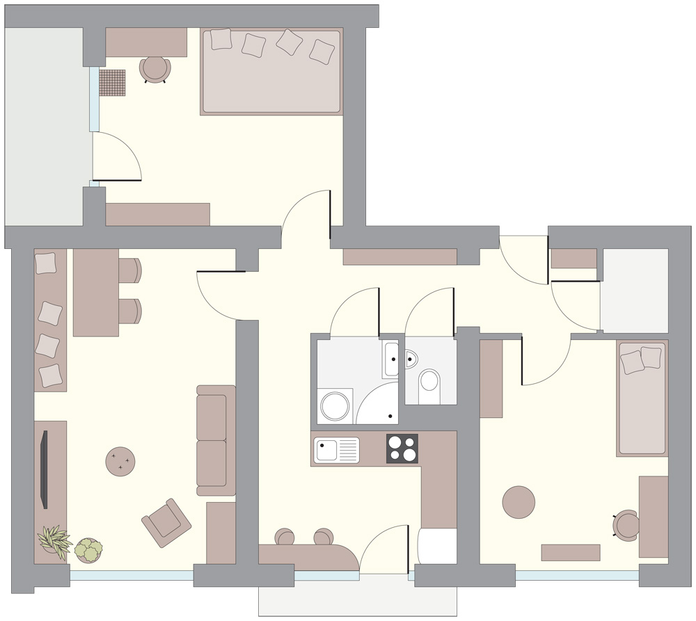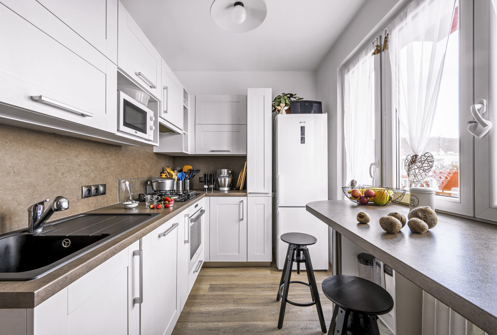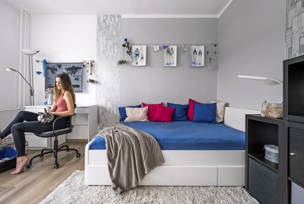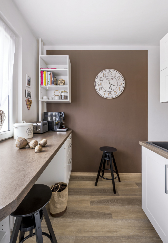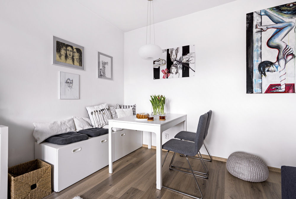 Byt v paneláku o rozloze 67 metrů má dispozici 3 + 1 a díky šikovně vymyšlenému zařízení a světlým barvám působí prostorně a velmi svěže. Dispozice se při rekonstrukci nijak neměnila, protože to nebylo potřeba. Jsou tu dva pokoje pro dcery, obývací pokoj s jídelnou, v němž je rozkládací pohovka s kvalitním lůžkem pro paní domu. V kuchyni se nabízelo vybudovat ještě menší jídelnu v podobě pultíku se dvěma barovými židlemi, v sezóně lze stolovat na balkoně, na který se vchází z kuchyně.
