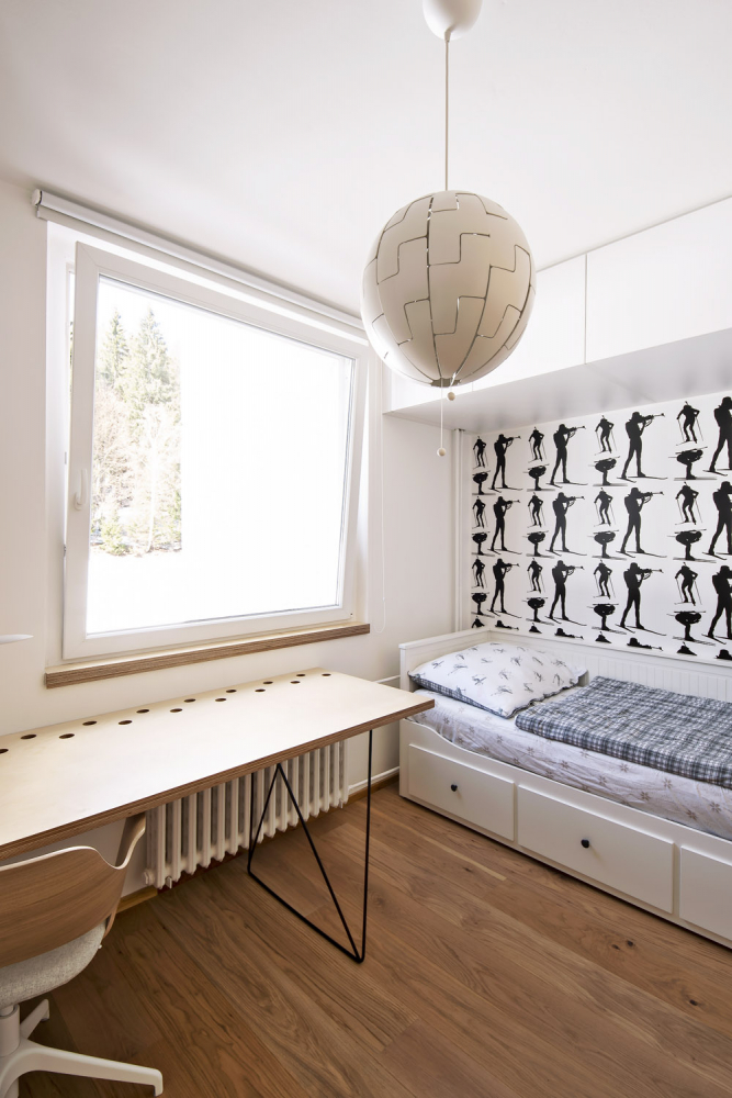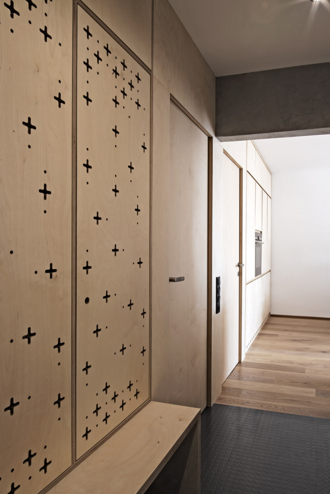 Tím, že bylo nutné do bytu dostat více pokojů, hrozilo, že by mohl ve výsledku působit stísněně. Proto tam architektka chtěla dostat hodně světla prostřednictvím použitých materiálů. Aby splnila i zadání dát do bytu dřevo, které na hory patří, vybrala si světlou březovou překližku, která prostor zateplí a zároveň prozáří. Navíc s ní velmi ráda pracuje, protože je to výborný materiál dovolující prořezávání a je pěkná i na hranách, jež je tak možné nechat viditelné.