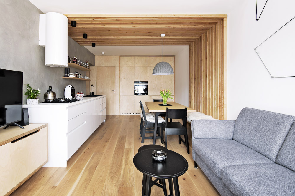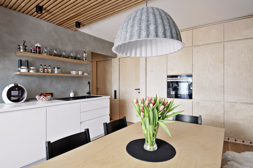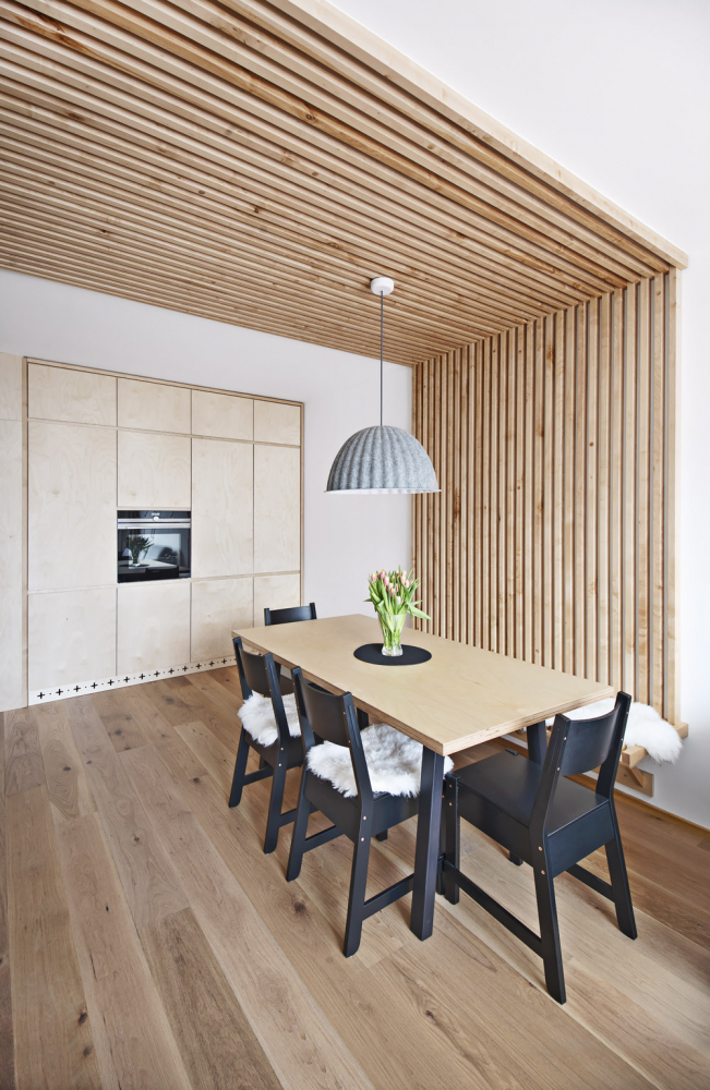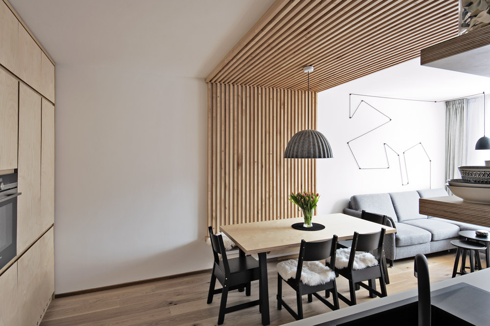 Jako základ, který udal interiéru tón, zvolila březovou dřevotřísku, z níž jsou vyrobené skříně i solitérní nábytek. Z masivních březových tyček vznikla lavice v jídelně, kdy pak tyčky přecházejí přes stěnu na strop, a vymezují tím jídelní a kuchyňskou část. Z masivního běleného dubu jsou podlahy. Dřevo doplňuje bílý neutrální nábytek vyráběný na zakázku (kuchyňská linka, úložné skříně v pokojích a v ložnici). S bílou výmalbou v bytě krásně ladí betonová stěrka použitá na zdi v kuchyni.
