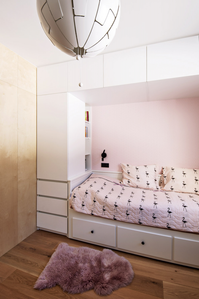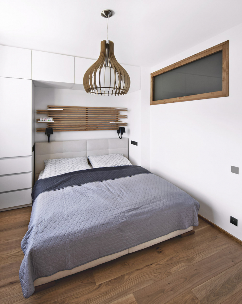 Všechno je tady dělané na míru tak, aby se vešlo maximum věcí, a zároveň aby byt už nemusel být zahlcen dalším nábytkem. Rekonstrukce i zařízení nakonec dopadlo skvěle a zprvu hodně vybydlený byt s nesmyslně velkou chodbou, spoustou dalších chodbiček a málo pokoji se proměnil v pěkný vzdušný třípokojový byt, který je uzpůsobený čtyřem sportovním nadšencům.